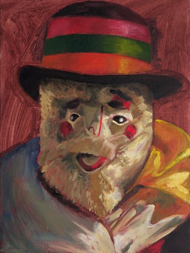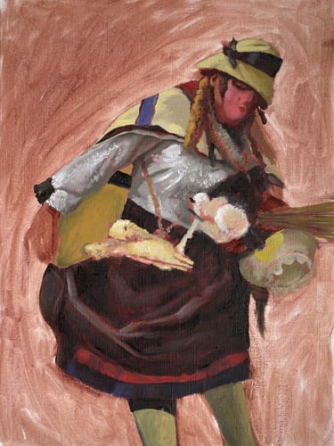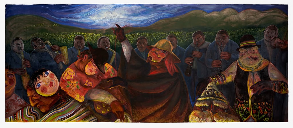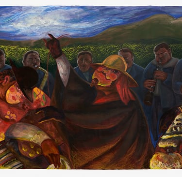 Visually, Sofía Carrasco’s paintings focus on the musicians of the traditional orchestra, the different characters of the festival, and especially the masks of the Tunantada. She was drawn to the contrast between Andean faces and the exaggerated masks used in the celebration, and to what these layers of identity reveal about representation and expression.