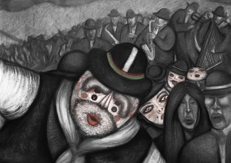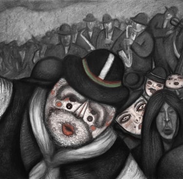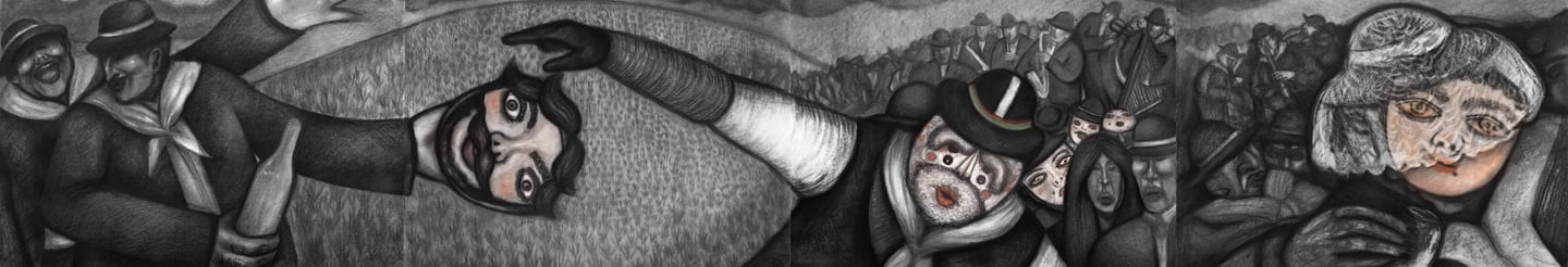 The compositions ¿Dónde Está Mi Alma Escondida? (Where Is My Hidden Soul?)and Vida Pasajera (Temporary Life) are complemented by a series of four charcoal drawings on paper that seek to represent my vision, experience and what intrigues me about the Andean dance and music festival of the “tunantada”: the Andean population, the use of the mask, the excessive consumption of alcohol, the connection with nature, the ritual character of the festival, the feelings of melancholy and nostalgia